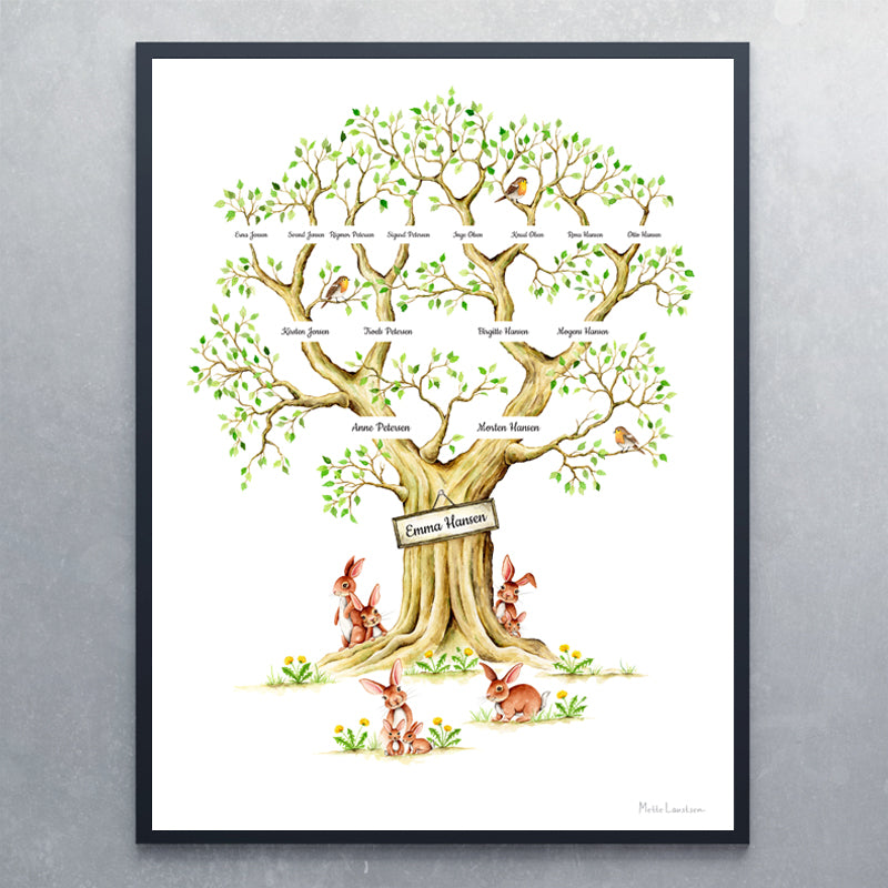 Flot stamtræ med familiens navne. Plakaten er oplagt som en unik og personlig gave til f.eks. dåb eller fødselsdag, og den giver mulighed for at barnet kan lære familiens navne at kende.